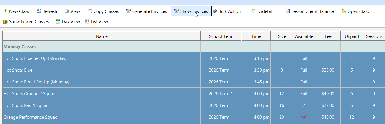 Click the Show Invoices button (as shown in the screenshot below). This will display all invoices associated with the selected classes.