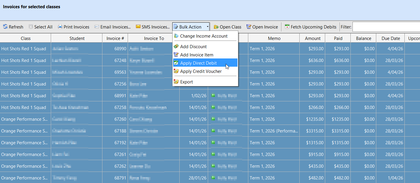 Once these requirements are in place, you can apply direct debit to invoices from the Class Explorer.